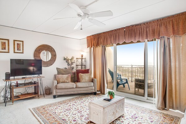 Inside, beachy bliss continues with a spacious layout boasting fun decor, comfortable furnishings, wood paneling on the ceilings, and ample natural light flooding through the sliding glass doors in the living area. Speaking of the living area, you will have plenty of ways to stay entertained with a TV, free WiFi, and plenty of seating to simply kick back with a good book in hand. When mealtimes come around, don't hesitate to show off your cooking skills in the full kitchen and gather with loved ones at the accommodating dining table. And, when the last light of day slips away, you can end each evening with a cocktail on the balcony before hitting the hay!