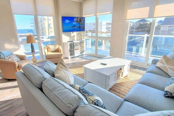 La nostra unità principale ad angolo ha una disposizione e un design moderni, freschi e spaziosi con vista sull'oceano da quasi ogni stanza. Le eccezionali caratteristiche di questo rifugio in condominio decorato in modo professionale includono: soffitti di 9 piedi, finestre dal pavimento al soffitto, un balcone panoramico con ringhiera in vetro e una cucina gourmet ben arredata. Ci sono splendidi pavimenti in legno stagionato, docce di lusso e una vasca da bagno indipendente. Abbiamo una varietà di configurazioni di camere da letto con armadi per organizer. I ventilatori a soffitto ventilano ogni stanza. Preparati un delizioso cappuccino con la nostra macchina automatica per espresso / cappuccino o usa il Keurig per il tuo tè o caffè mattutino. Lavare e asciugare i vestiti nella lavanderia dedicata.
