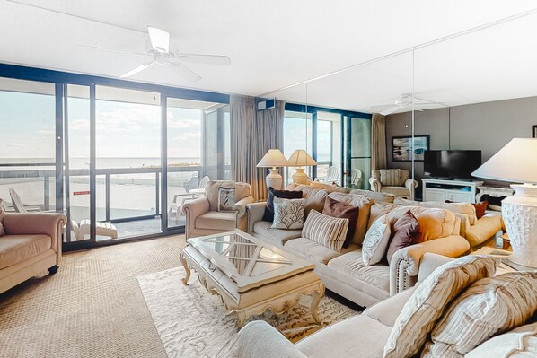 This coastal condo is perfect for your next beach-cation! It's well-equipped with everything you and your guests could ever need to spend a carefree and restful vacation. The kitchen has been equipped with all the essentials, including a full-size fridge, stove, oven, coffee maker, and microwave, and a convenient three-person breakfast bar. Don't hesitate and surprise your loved ones with savory meals and beach snacks during your stay. The living area is all about comfort and coziness with inviting furniture and a TV. Then, make your way over to the private balcony and get ready to experience a picture-perfect sun set that will blow your mind! The on-site washer/dryer will make your laundry duties a cinch!