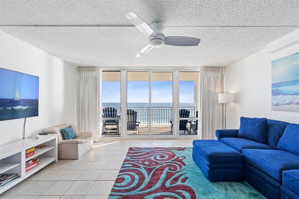Maximizing the unit's space, the open design allows your group to enjoy the main living area without stepping on anyone's toes. Sink into the comfy sofa couch and stay up to date watching TV or make it a movie night with some popcorn. All rooms with smart TVs. Watch the stars come out as you sit and relax on your private balcony. Keep everyone fed and on the go when you create a quick culinary delight in the fully stocked kitchen. As the day comes to an end, you have your choice of accommodations. The master bedroom boasts a king bed and overlooks the ocean. The second and third bedrooms each have 1 queen size and 1 full size bed.