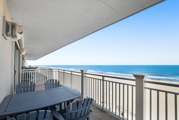 Oceans Mist offers large luxury oceanfront units that overlook the beach and boardwalk. The 2,200-square-foot home is fully equipped with a washer/dryer, dishwasher, microwave, and central air. Three living room sofa beds (one queen, and two twin sizes) provide added comfort. When you're not out on the beach, kick back in the living room to watch your favorite movies and shows on the large flatscreen TV. The private balcony is a great place to enjoy a cup of morning coffee or a glass of wine in the evening.