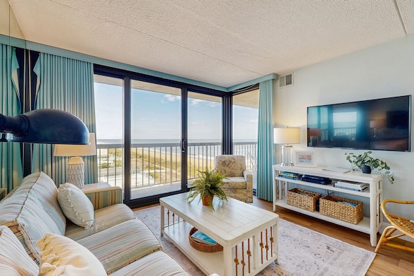 As you enter the condo, you'll be greeted by an open living space, a mirrored wall that maximizes the sunlight and the ocean view, and access points to the balcony in both the living room and the primary bedroom. There's also a full kitchen, free WiFi, and a Blu-ray/DVD player in the living room.
