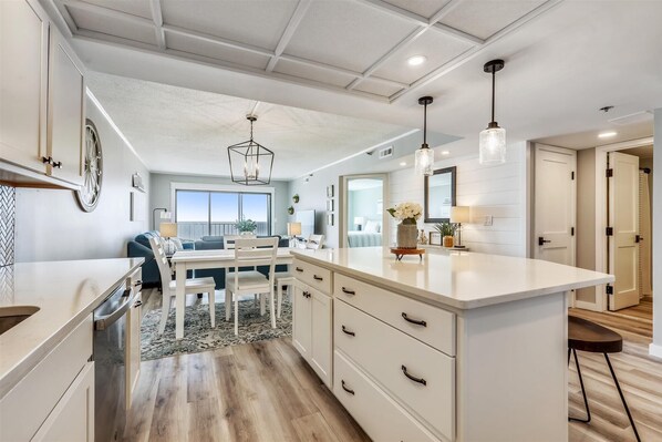 PLAZA 604 9800 Coastal Hwy. NON SMOKING - NO PETS / OWNER HAS A PET. Direct Oceanfront 2 bedroom w/enclosed den, 2 bath condo. This well placed, gorgeous "right out of a magazine" condo has been taken down to the studs and completely renovated IN 2021. The adorable den is enclosed for privacy, with a queen bed; The luxurious master bedroom has a king bed, the guest room two full beds. There is a new pull out couch in the living room with plenty of seating area for the entire family! Luxury paneled floors throughout and BRAND NEW EVERYTHING! Gorgeous quartz countertops in the kitchen, with a large island for all your cooking needs! Situated over the pool, this condo is not too high, but high enough for great people watching and great views of the ocean beyond.