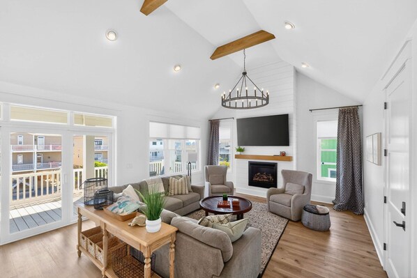 The main living room is located on the top floor of this open-concept home with a reverse floor plan and has tall vaulted ceilings that provide an airy and spacious area to relax after a long day at the beach. Step through the extra wide sliding glass door to the back patio deck and enjoy views of the pool, the island, and even the beach! A large flat-screen television and comfortable couch can be found in the second living area, which is on the first floor of the house. Additional items like pack n play, highchair, paddle boards and bikes provided!