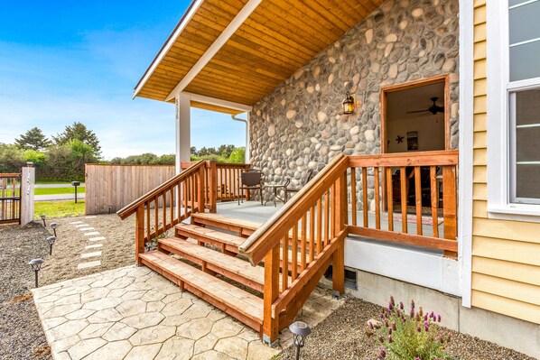 Cobblestone Cottage is just a stone's throw from the great Pacific Ocean. Waiting for you across the road and beyond the trees are miles and miles of wide sandy beaches. Listen to the waves roll while relaxing for dinner or drinks in the private picnic area.