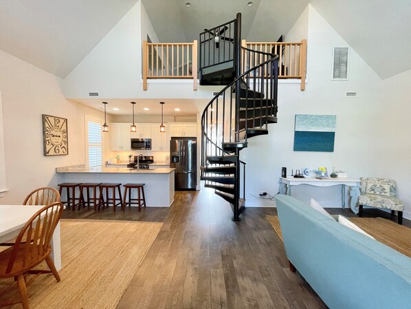 3 camere da letto, 3 bagni. Camera da letto principale con un letto matrimoniale e bagno privato con doccia piastrellata. Due camere da letto ciascuna con un letto matrimoniale. Loft al secondo piano con tre letti singoli.