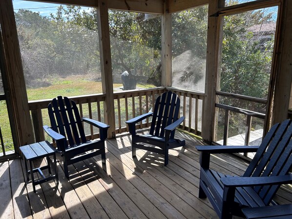 Le offerte esterne 2 portici schermati di cui uno 21 'x 16' Veranda con tavolo da picnic, un fronte veranda coperta, ampio cortile, doccia esterna calda / fredda, griglia a carbone, banco di pulire il pesce, altalena ponte e amaca.