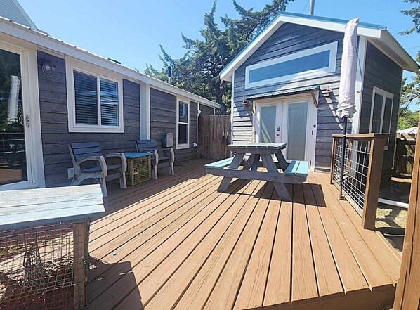 L'edificio principale offre un open space con un piccolo soggiorno / sala da pranzo e cucina completa con fornelli a gas, frigorifero, forno a microonde e caffettiera Keurig. Camera da letto con letto matrimoniale e TV. Bagno completo con vasca / doccia. Stack lavatrice / asciugatrice.