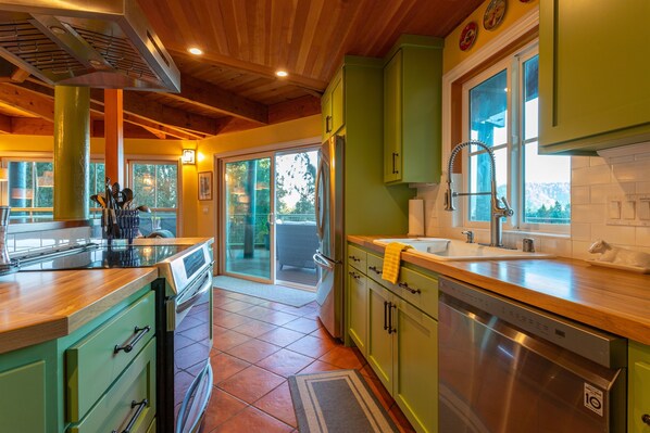 Perfectly equipped for home cooking or special dinners in, the chef’s kitchen features: