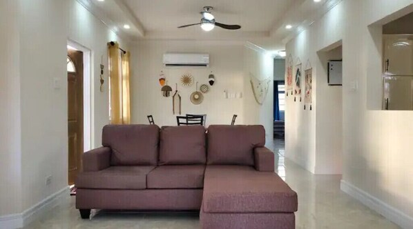 Spacious and beautifully designed, Blue Roof Villa offers a comfortable living area for up to 6 guests to relax and unwind. With 1421 square feet of well-lit living space there is plenty or room to spread out and enjoy your stay. The villa features an open living and dining area with large window and comfortable furnishings. The kitchen is fully equipped with modern appliances. Two of the bedrooms feature queen-sized beds while the third has two twin beds. There are smart TVs, ceiling fans and AC units in the bedrooms and living area. Washing machine and dryer are on the property.