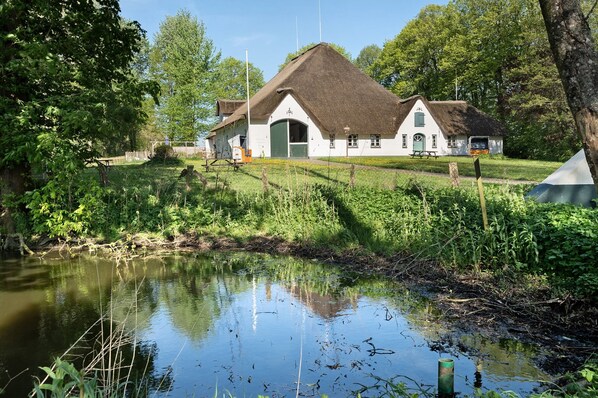 Pohns-Warft si trova su Eiderstedt, una penisola nella Frisia settentrionale, vicino alla pittoresca cittadina portuale di Tönning. In posizione tranquilla e isolata, sorge il bellissimo casale tradizionale con tetto di paglia. È un luogo ideale per lasciarvi alle spalle la quotidianità e rigenerarvi. Potete scegliere se godervi la tranquillità o esplorare i dintorni e visitare le numerose attrazioni della zona. Davanti al casale trovate un prato con posti a sedere e due sedie da spiaggia. La struttura è adatta ai bambini e offre un piccolo parco giochi per arrampicarsi, dondolarsi e giocare. Entrando dal grande portone si nota la tipica costruzione di un Haubarg. Una strada alberata lunga cinquecento metri conduce dalla strada principale al casale, circondato da un fossato. Questo Haubarg è sotto tutela monumentale.