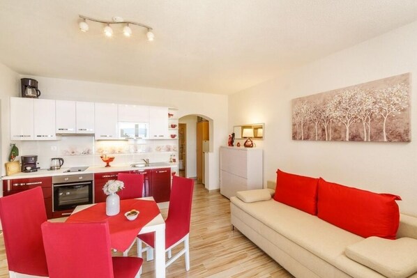 La piantina accuratamente studiata offre una camera da letto separata con letto matrimoniale, nonché sistemazioni flessibili per dormire su un divano letto e un letto aggiuntivo. L'attrezzatura garantisce una piacevole sensazione di abitabilità, sia per soggiorni brevi che per vacanze più lunghe.