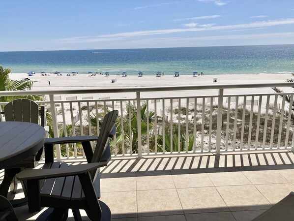 Il nostro condominio è decorato professionalmente in un motivo dell'isola. Il soggiorno si apre sul grande balcone con vista libera sulla spiaggia di sabbia bianca di zucchero, sul Golfo del Messico e sulla piscina paesaggistica. Troverai viste spettacolari sul tramonto e sull'alba come puoi vedere in tutte le direzioni. Guarda i pescherecci che attraversano il Passo Perdido mentre bevi il caffè del mattino sul balcone. L'enorme balcone è arredato con un tavolo e 6 sedie e 3 lettini per godersi il panorama mentre si mangia o si rilassa.