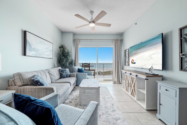 The bright living area includes a sleeper sofa, flat-screen TV, and access to the private balcony with stunning views of the Gulf.