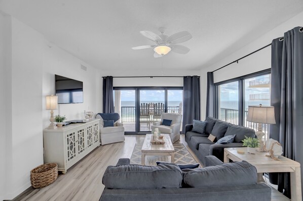The living room, the heart of this condo, is where memories are made. It's a space designed for comfort and entertainment, featuring a Queen sofa sleeper and offering access to the wrap-around balcony. Here, you can soak in the breathtaking views of the Gulf, making it an ideal spot for morning coffees or evening cocktails.