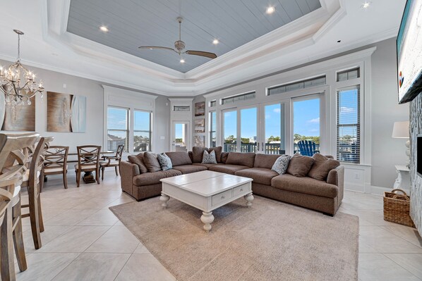 Multiple Living Spaces – Two expansive living areas with plush seating, HDTVs, and coastal-chic décor.