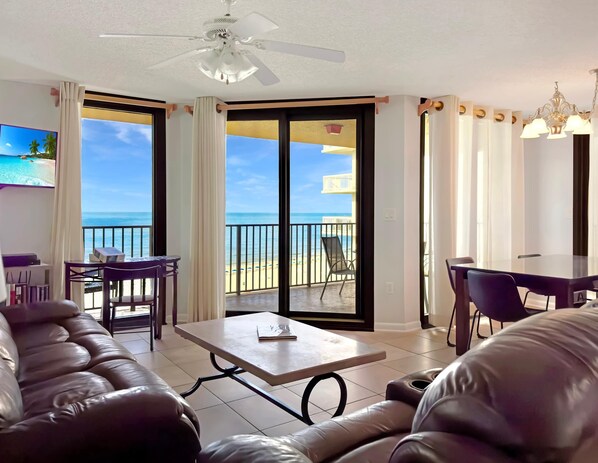 Step into a bright and open living space designed for comfort and coastal style. The living room features ample seating, a large flat-screen TV, and direct balcony access—perfect for catching sunrises, sunsets, and the rhythm of the waves.