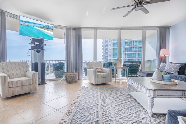 Spend quality time with your loved ones in the tranquil living room featuring a comfy seating area with a Queen sized sleeper sofa, relaxing and cozy décor, bright floor-to-ceiling windows, a stylish wet bar, and TV.