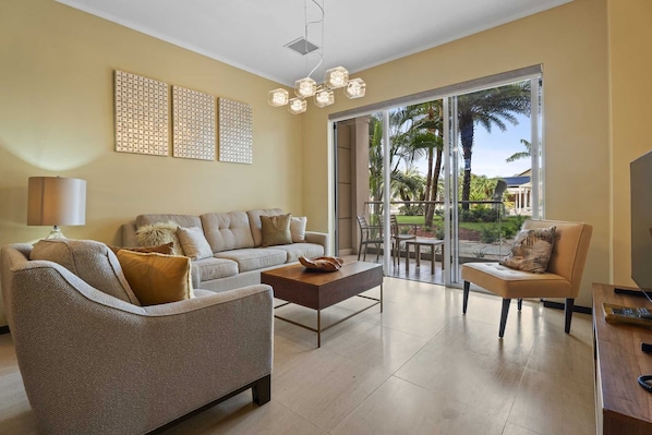 La zona giorno open space è dotata di una grande TV, un divano letto a 3 posti (con un materasso matrimoniale), 2 sedie aggiuntive, un tavolo da pranzo da 6 posti e una cucina moderna completamente attrezzata con 4 -sgabelli da bar. Questo condominio dispone di una caffettiera Keurig (porta la tua K-Cup ad Aruba!). Il corridoio d'ingresso dà accesso ad un mezzo bagno. C'è anche una lavatrice e asciugatrice in camera disponibili per il vostro comfort.