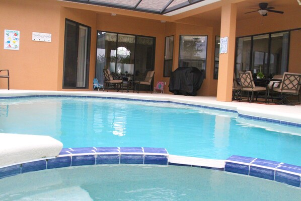 C'è una piscina esposta a ovest con un lanai e un'area protetta con sedie, aree per sdraiarsi e giocare per ore di divertimento. Una griglia per barbecue è fornita per comodità d'uso.