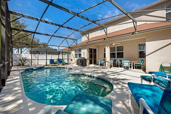 This spacious 5-bedroom retreat offers everything you need for an unforgettable vacation—including a private, south-facing screened pool & spa that enjoys sunshine all day long, two inviting living areas, a fully equipped kitchen, and a fun-filled game room. Located just minutes from Disney and Orlando's top attractions, this beautifully updated home is designed for comfort, convenience, and creating lasting memories with family and friends.