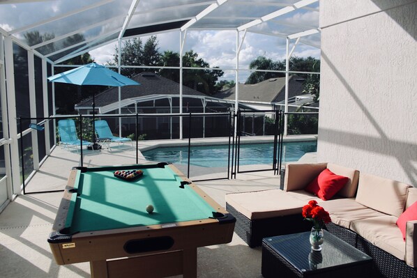 When we arrived there was a huge pile of trash in the front yard from the previous occupants. The floors of the kitchen and bathroom were filthy, there were dirty dishes left in the dishwasher, we had to wash our sheets before using because they were visibly dirty, the bathtub wouldn’t drain and was disgusting because everything lingered instead of draining out, we had to clean out food debris and filth before putting away clean dishes. The overall cleanliness of the place did not meet our standards. There were no bath towels, hand towels, washcloths, toilet paper, paper towels, hand soap, pot holders, etc. All of the basic things you would expect to be in a rental house were missing. There were no prep bowls for cooking, pans were unusable from over use and wear, not enough dishes for 8 people. We had to buy multiple things just to be able to stay. The property manager communicated various things that were going on but did not bring enough towels for everyone in our group to have one and only brought four rolls of toilet paper for a weeklong stay with eight people. She reimbursed us for the initial things we had to buy but as the week went on and we needed more things that came out of our pocket. Pool table was broken and unusable. Location was good, safe neighborhood, close enough to Disney to be convenient.