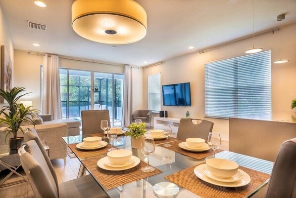 - Main Floor • Open-concept living room with TV and comfortable seating • Fully equipped kitchen • Dining area • Direct access to the pool area