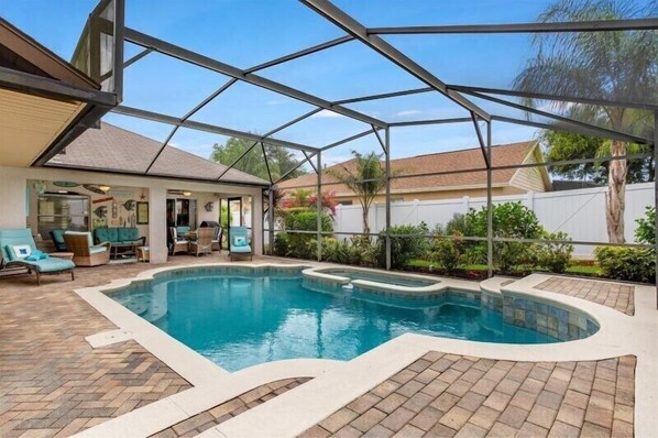 The outside area is truly lovely. The pool and oversized spa are set out on a fantastic pool deck which has been thoughtfully designed to include plenty of space to enjoy the sun, and also a very welcome lanai for enjoying meals and some time in the shade. The pool area is set within the private garden belonging to the property, which affords a great degree of privacy for you to enjoy your stay.