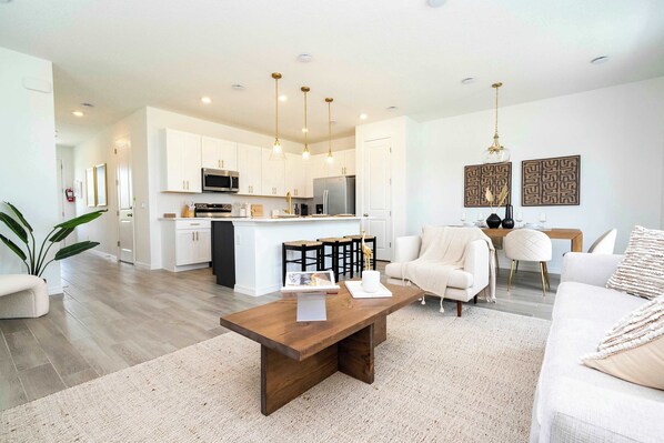The heart of the home is a sleek modern kitchen featuring white shaker cabinets, gleaming gold hardware, stainless steel appliances, and a large island with woven-bar seating—perfect for casual breakfasts, sunset cocktails, or meal prep. Refresh and relax in spacious living areas filled with natural light, cozy seating, and warm wood finishes. Kick back on our queen-size sleeper sofa, perfect for lazy mornings or movie nights!