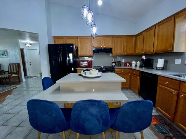 The kitchen features new quartz countertops & island table with 4 velvety chairs. It is fully equipped with all the kitchen essentials but not limited to cookwares, coffee maker, microwave, rice cooker, waffle maker, kettle, toaster, blender, etc. Plenty of coffee cups & mugs with complete sets of eating utensils included.