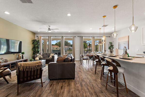 Access to the pool area from the large full-width sliding glass doors from the open pan (fully equipped) Kitchen, dining and living room so you can watch the action outside or take in your favorite show inside.