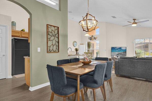 The Disney Getaway features fresh modern and comfortable accommodations with extraordinary amenities. Recently remodeled from top to bottom with fresh paint, new flooring, granite countertops, lighting, ceiling fans, fixtures and blinds plus new living, dining and master bedroom furniture and mattresses. The game room was also remodeled with a new pool table, foosball, arcade multi-game, TV and more. For non-park days, there is a covered lanai and a private heated* pool with attached spa and plenty of deck space for sun lounging. Your family will have fun for hours and make memories for a lifetime! Even the landscaping was refreshed, with tropical plants added around the pool cage for increased privacy. The result is a great space for couples, groups and families with a spacious open concept living space with room for up to 8 guests and fun for all ages. The perfect place to unwind after the parks and attractions, or just to spend the day enjoying Florida.