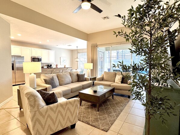 The Disney Rest at Windsor is a completely updated and locally managed 2224 square foot four-bedroom / four-bathroom, air-conditioned vacation villa that sleeps up to 11. Pull into your private driveway and walk through the front door into a spacious, open-concept living area with contemporary décor. The great room is well appointed with comfortable furniture perfectly positioned to catch your favorite shows on the 65" smart flat screen or enjoy the pool views through the glass wall. There is also free Wi-Fi and cable throughout the home, so you can keep in touch with friends back home.
