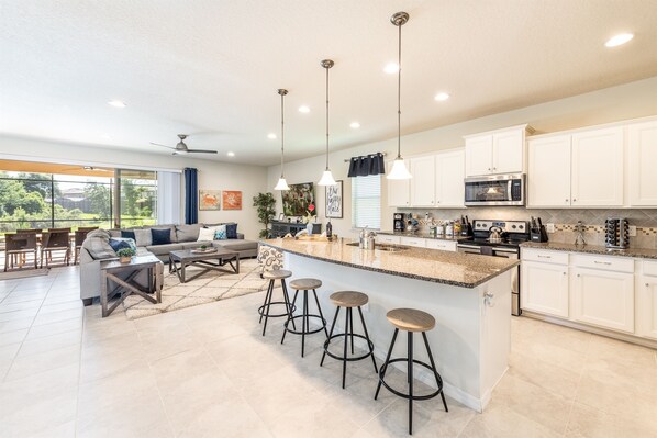 Great house for multiple families and kids. We had 5 adults(3 families) and 4 kids. Plenty of room for all. House was exceptionally clean in all areas. Kitchen had all the necessities and appliances you need. Everything was as described. Beds were very comfortable. Pool and hot tub were great and the owner always has it on—no cold water! Owner was very responsive to the one minor need we had. Easy access to Disney World—20 minutes. If I come back I would definitely stay again.