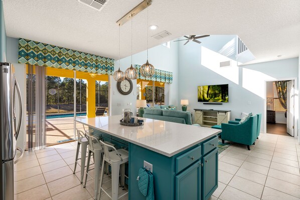 The second family room is to the rear - a large open light room with high vaulted ceiling. It has a fully equipped kitchen - with all new appliances and double door pantry fridge with drawer freezer. The new quartz large island with seating for 8 allows for casual dining or cooking up a feast - there are plenty of pots and pans, glasses and dinnerware, including outdoor unbreakable ones. You can relax in the spacious TV area, watch TV or just gaze out at the lovely view over the pool to the water and conservation beyond.