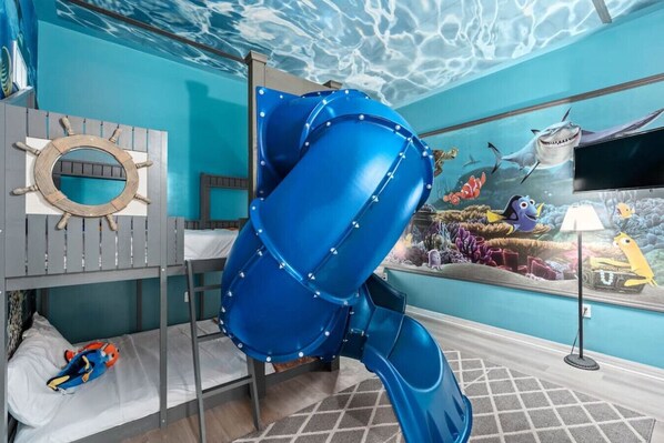 Embark on an underwater adventure in our Finding Nemo themed kid's bedroom, complete with a slide and enchanting underwater lighting.