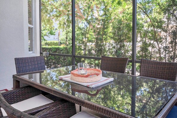 Private, enclosed pool deck with seating area, dining table for 4 and gorgeous swimming pool with spa.
