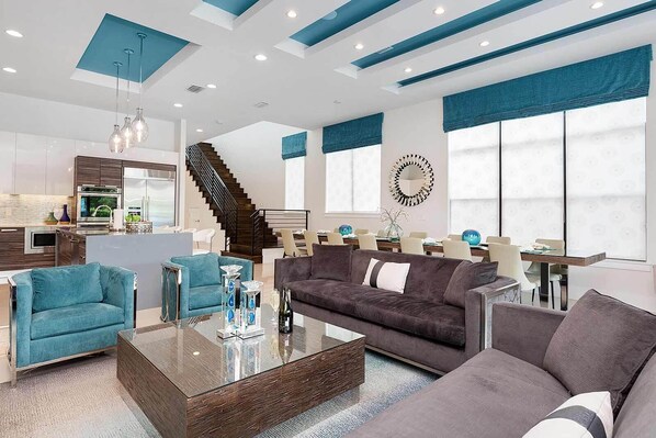 Dietro le vetrate scorrevoli dal pavimento al soffitto, goditi l'elegante e aperto spazio abitativo della tua villa, completo di due morbidi divani, due sedie accentate e un'impressionante TV a schermo piatto. I pavimenti bianchi e lucidi conferiscono un ambiente pulito e lucido all'intero piano principale, che ospita anche una spaziosa cucina e zona pranzo.