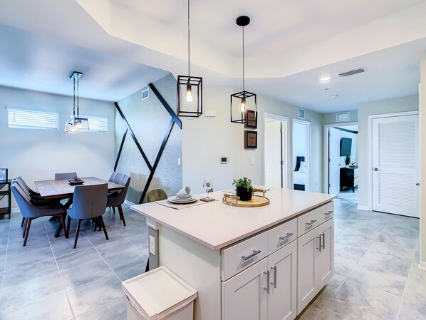 Fully equipped Kitchen with Isle, Dining Room (6 people), Living Room with Smart TV.