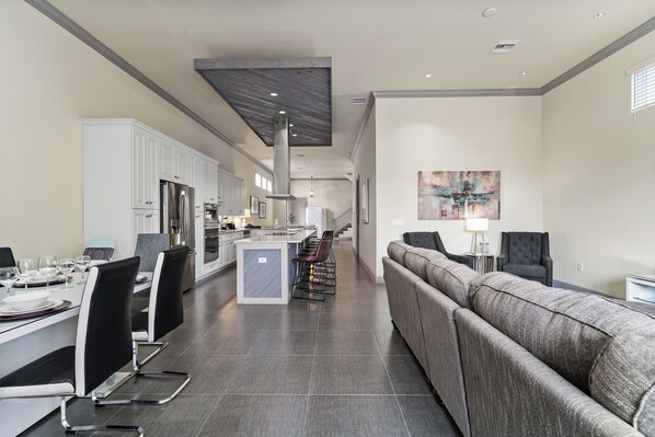 Nestled in the sought-after Liberty Bluff neighborhood within Reunion Resort, this beautifully designed home welcomes you with a warm and open layout. Upon entering, you're greeted by a stylish dining area that flows seamlessly into the first living space, complete with a wine rack that adds an elegant touch. The kitchen is a chef's dream, featuring a large island with a sleek flat top stove and bar seating for six, making it ideal for both everyday living and entertaining.