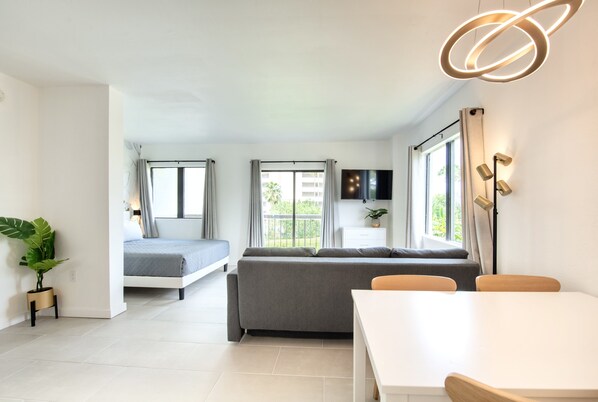 The condo is very spacious for being a studio. It has a basic equipped kitchen which allows to prepare meals if you want to eat in. It has a two burner induction cooktop but there is no oven. We do have a toaster oven though to bake, toast or heat up meals. You will also find a microwave and a filter coffee machine.