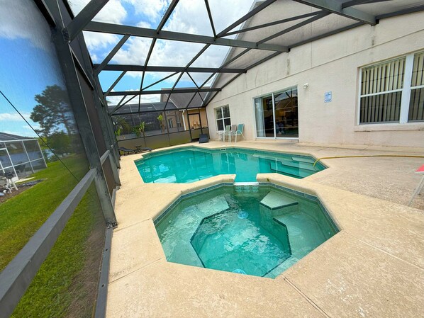 Step outside to your own private oasis, a heated pool and hot tub enclosed by a screened lanai. With lounge chairs, seating, and total privacy, it’s the perfect place to soak up the Florida sun, enjoy a drink, or cool off after a park day. The tropical vibe and open space create a resort-like experience right at home.