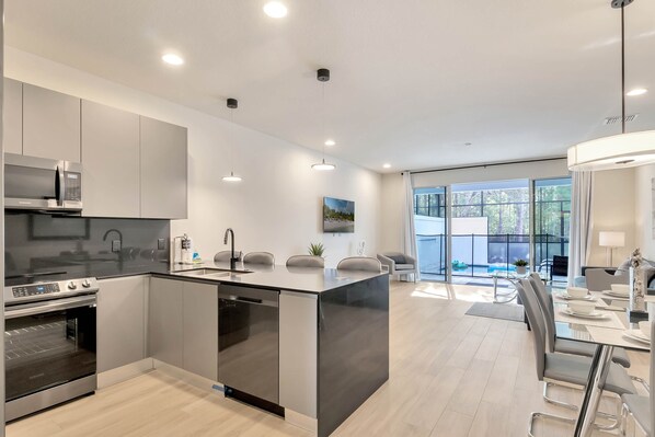 !!!Please contact us for monthly specials (up to 3 months)!!! Welcome to Florida, Miami style. This brand new property screams luxury and contemporary. You will LOVE the open floor plan, the design and the views on the conservation area. The property sleeps up to 6 guests and has a very airy layout. Downstairs there is a queen bedroom with an attached bathroom (shower tub). A fully equipped kitchen (oven, stove, dishwasher, fridge, microwave, coffee maker, utensils, pots and pans...). The kitchen has an unobstructed view on the living room and on the pool area and the conservation. You will enjoy cooking your meals while interacting with your family and friends in the same space. Upstairs there is a den with a TV and couch. A bedroom with two twin beds and a private bathroom (bathtub), and of course, a huge master bedroom with ensuite (2 vanities and a shower tub). Each room as its own TV. There is also a washer and a dryer for your convenience. And on top of that, you get complimentary access to the clubhouse (gym, game room, heated pool and spa). This home is located in an eco-friendly subdivision (Hidden Forest) and it will take 5 minutes only to drive to the nearest Walmart or Publix and about 17-20 minutes to hit the parks (Disneyworld is only 18 min drive). Exceptional location. Amazing brand new property. Don't wait any longer. Book it.