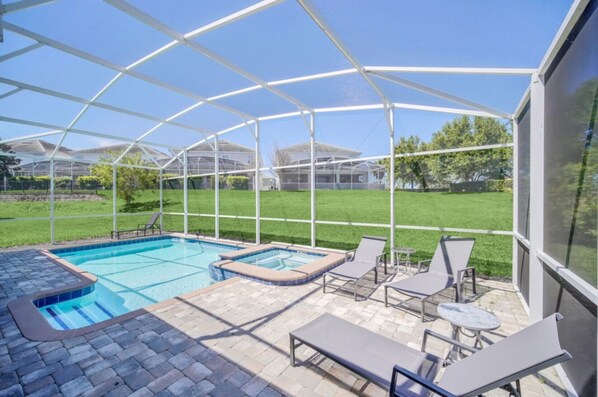 Pool & Patio Area: Private Pool & Spillover Spa: Unwind after a long day of exploring Orlando’s attractions in your very own private pool and spa. Outdoor Dining Area: A dining table with seating for 8 allows you to enjoy meals al fresco. Sun Beds: 4 sunbeds are provided for lounging by the pool, offering plenty of space to soak up the Florida sunshine. Additional Seating: Comfortable seating for 5 ensures everyone has a spot to relax and enjoy the outdoor space.