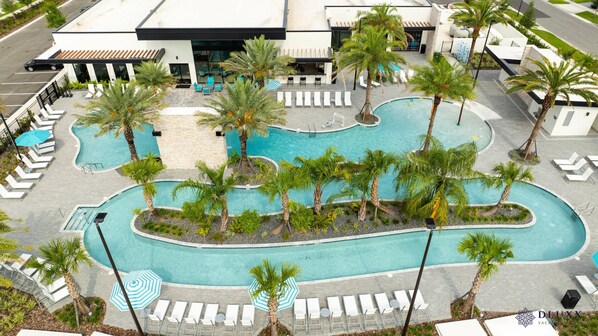 amenities, including a pool with a lazy river, a fitness center, and a