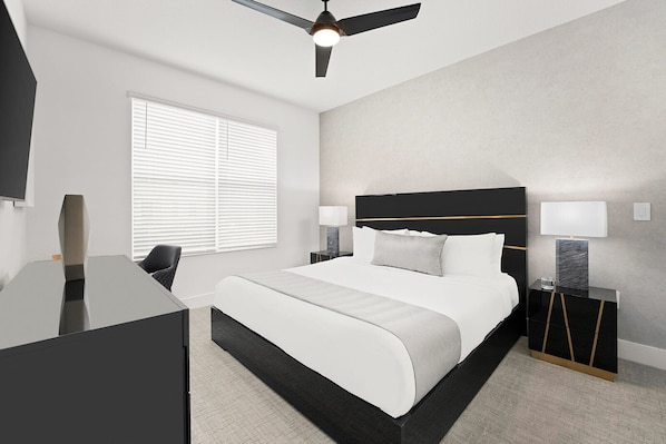 Urban sophistication meets cozy vibes in this super chic 4-bedroom gem on Orlando's International Drive–steps from the best theme parks, attractions, dining, and shopping this epic city has to offer. Set your bags down in one of three delicious king bedrooms, and send the littles off to enjoy the whimsical themed bedroom—where their imaginations will run as wild as the Universal Orlando coasters down the road. Start or end your day at your private pool ft. loungers, a patio table, and more.