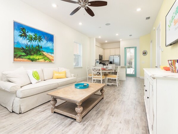 Entrando in questo cottage a due piani, troverete la cucina sulla vostra destra, che conduce alla sala da pranzo e alla zona giorno. Il tuo macchinista congelato si troverà nella cucina completamente attrezzata, che include tutti gli utensili, gli elettrodomestici e le pentole necessarie per creare i tuoi piatti preferiti e le bevande ghiacciate durante le vacanze. Riunisciti nella sala da pranzo per gustare un buon pasto in famiglia, forse la tua versione del cheeseburger firma in paradiso. Calcia i piedi e rilassati nella zona giorno dopo una giornata di sfreccianti via di nuovo a Margaritaville. A sinistra dell'ingresso è un mezzo bagno, per una maggiore comodità. Immerso nella hall di fronte al bagno di servizio è una combinazione di lavatrice e asciugatrice, che consente di imballare leggermente per lasciare un sacco di spazio per i souvenir. Salire sul portico spazioso, offrendo un'atmosfera pittoresca per godersi un sacco di tempo per la famiglia.