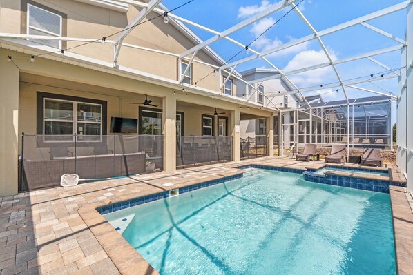 - Private pool (extended size) and SPA in the screened lanai with child safety fence