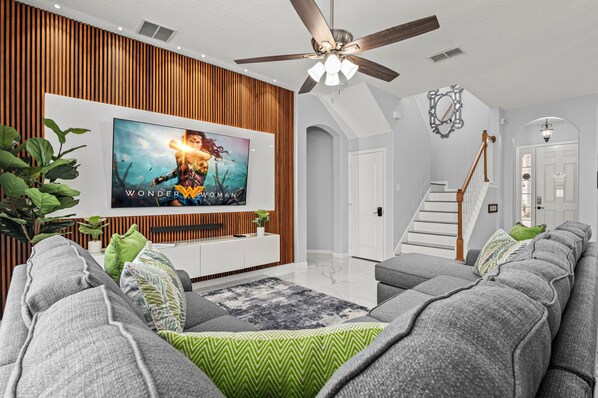 Our open plan modern living area features a bespoke feature wall and huge ROKU streaming tv complete with soundbar, marble effect flooring and brand new furniture set featuring an L shaped sectional and new tables.