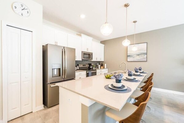 Discover ultimate comfort in our chic 4-bed townhome at Storey Lake. With Mickey and Star Wars themed bedrooms, it's perfect for families. Resort amenities like pool, fitness center, tiki bar, and mini-golf enhance your stay. The open living, dining, kitchen spaces cater to 10 guests, and the private pool adds relaxation. Your unforgettable getaway begins here.